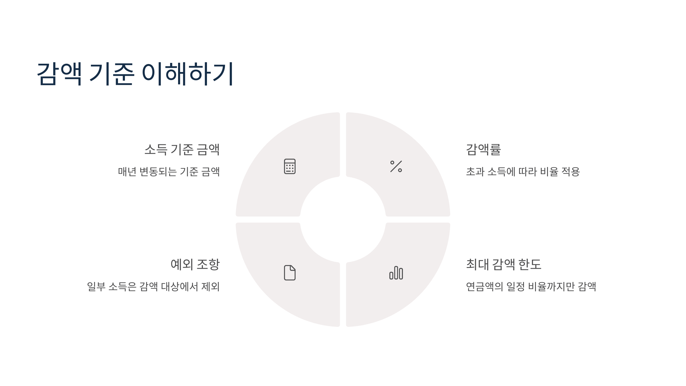 - 소득 구간별 감액률: 기준 초과 소득 구간에 따라 감액률이 달라짐