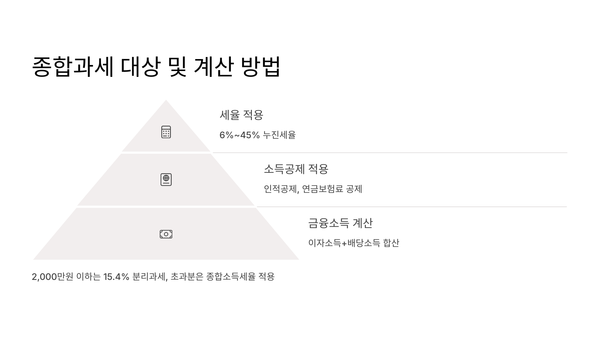 | 종합과세 대상 | 금융소득 합계액이 2,000만 원 초과 시 | 6% ~ 45% (누진세율) | 다른 소득과 합산하여 과세 |