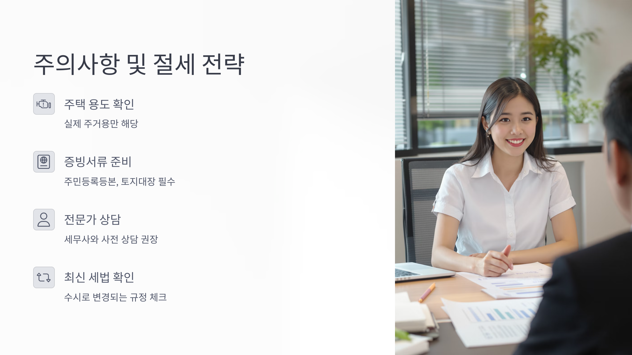 - 농촌주택 취득 전에 반드시 세무 전문가와 상담하여 절세 가능성을 확인하는 것이 좋습니다.