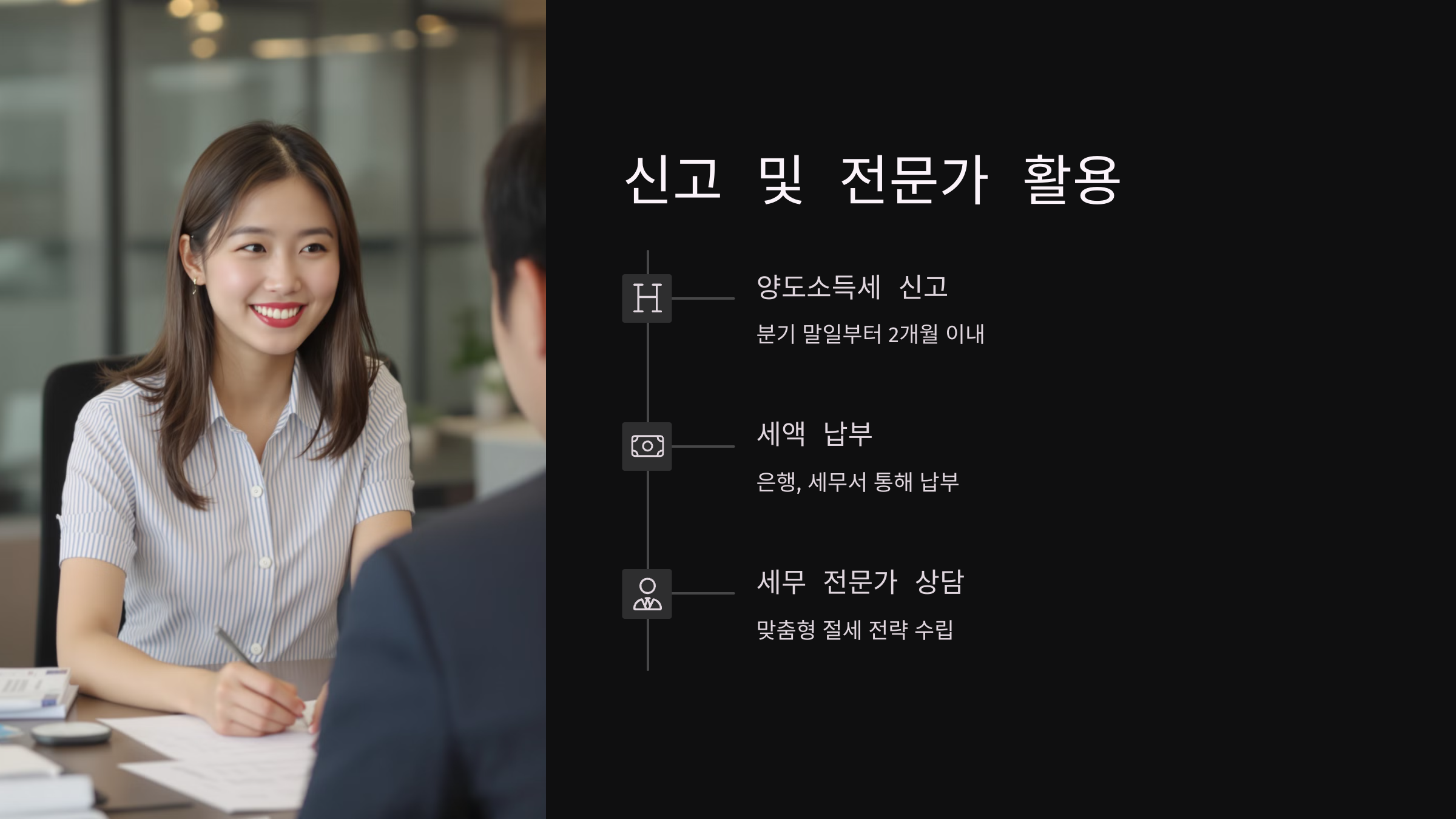 | 세무 전문가 활용 | 세무 전문가 상담 및 대행 | 최적의 절세 전략 및 정확한 세금 신고 | 세금 절약 및 가산세 방지 | 우리나라 세법에 대한 이해도 높은 전문가 선택 |