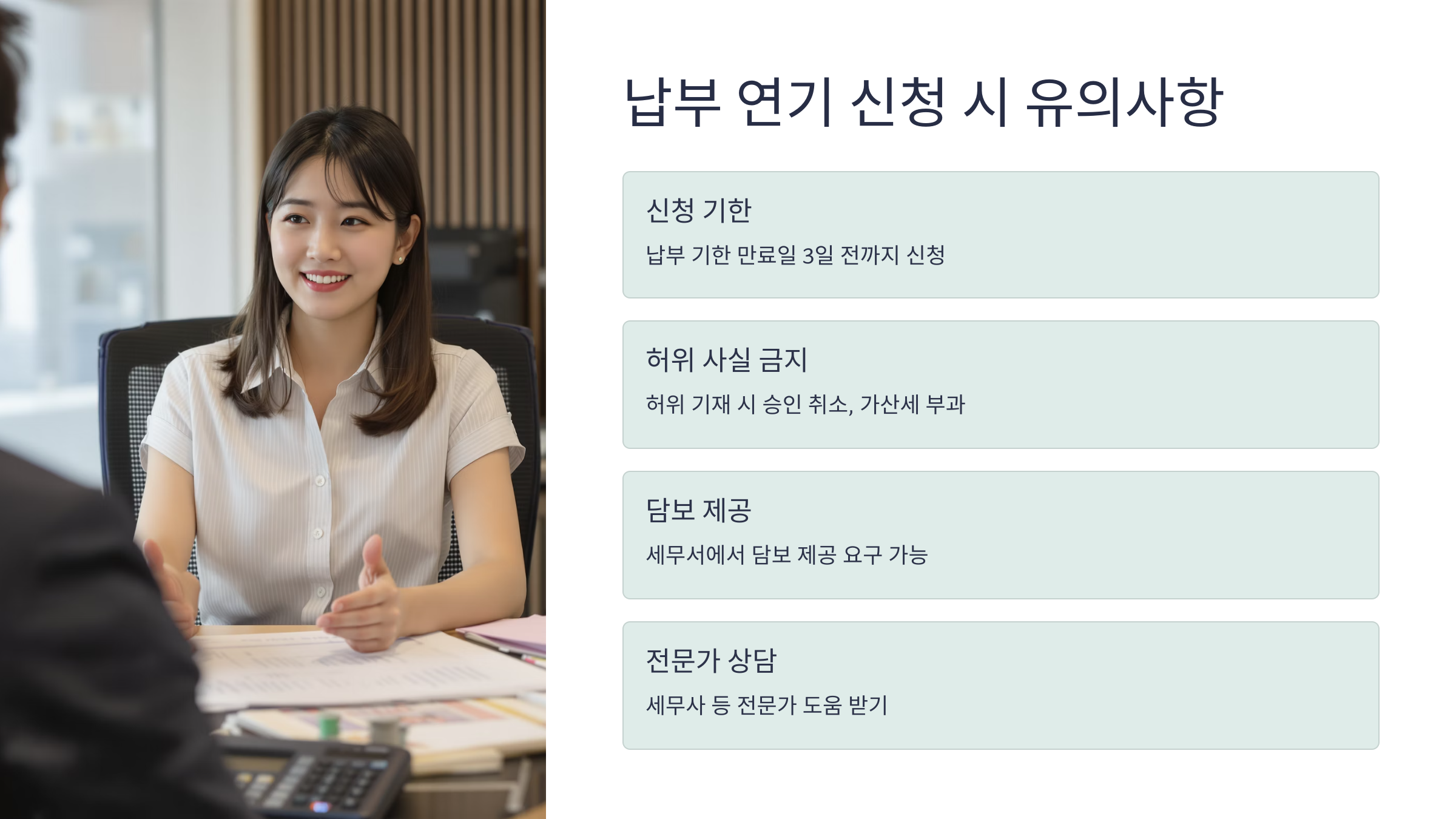 - 담보 제공 요구: 세무서에서는 납부 연기를 승인하는 조건으로 담보 제공을 요구할 수 있습니다.