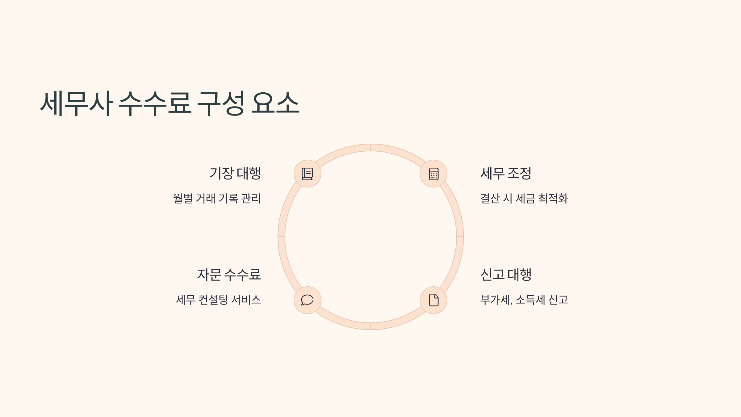 - 신고 대행 수수료: 부가가치세, 소득세, 법인세 등 각종 세금 신고를 대행하는 서비스에 대한 비용입니다.