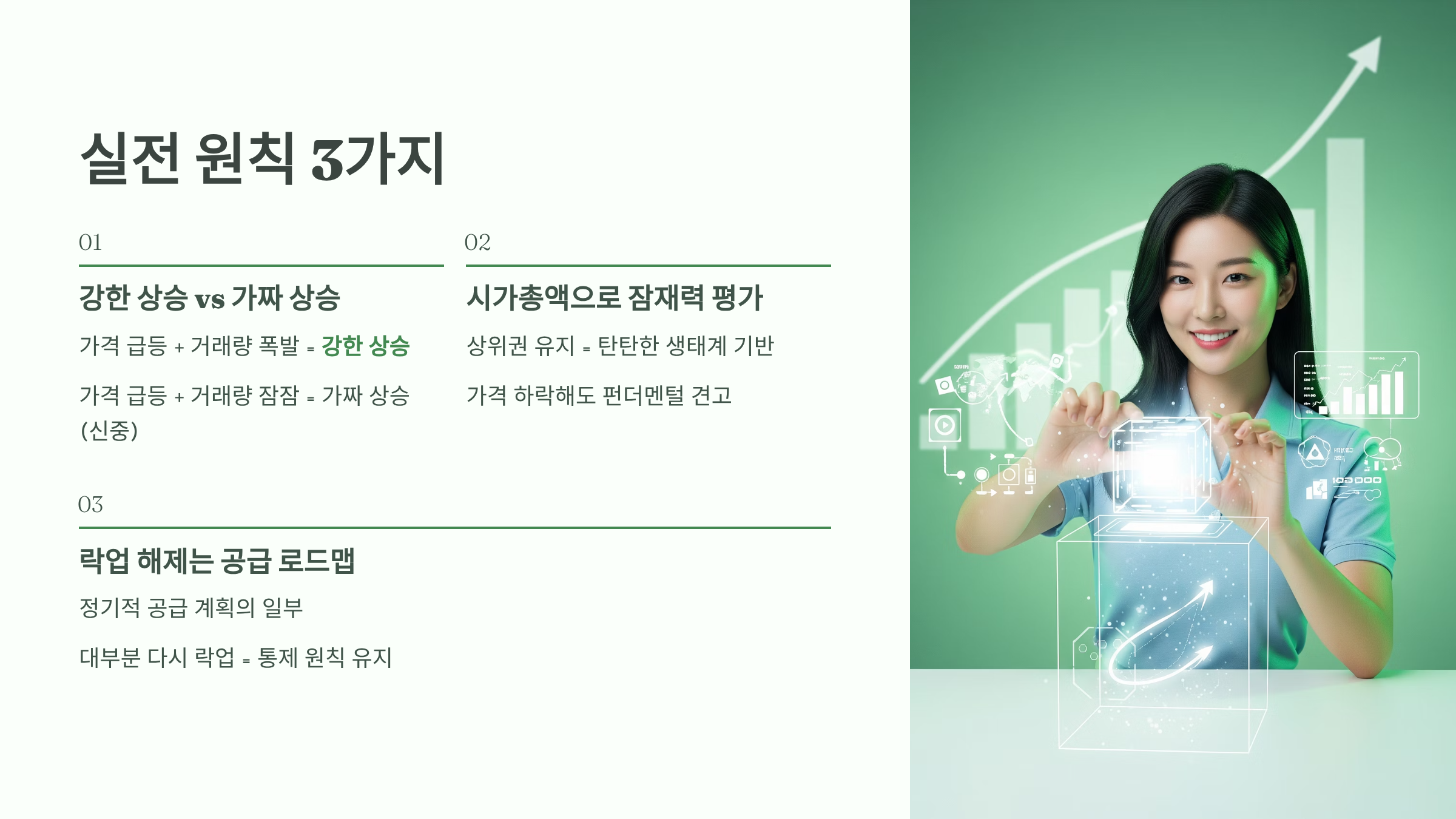 단순히 지표를 아는 것과, 그것을 투자에 활용하는 것은 다릅니다. 이 세 가지 지표를 바탕으로 리플을 가장 안전하게 바라보는 실전 원칙을 알려드립니다.