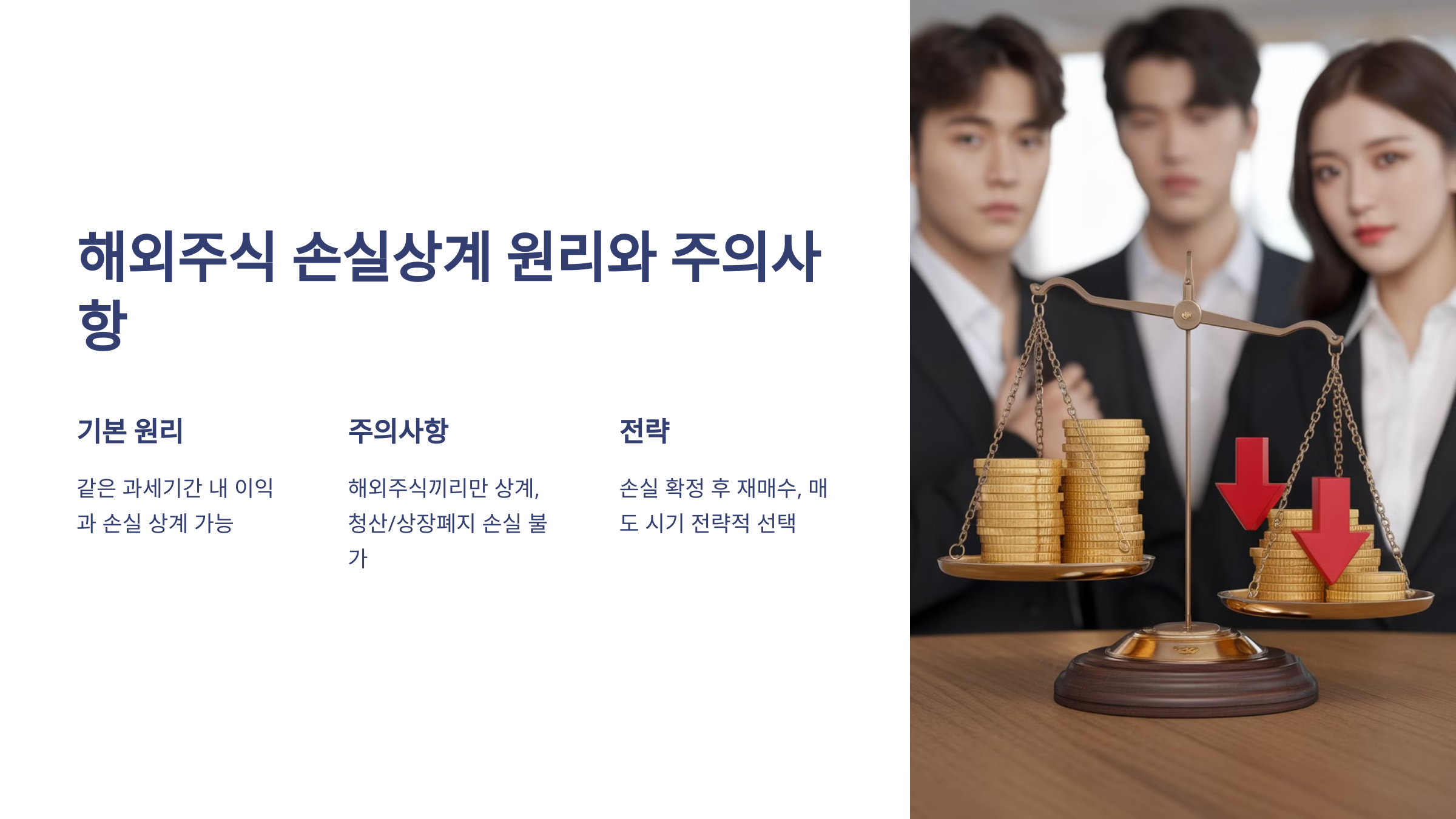 해외주식 거래에서 발생한 이익과 손실은 같은 과세기간 내에서 상계할 수 있습니다. 예를 들어 A 종목에서 1,000만원의 이익이 발생하고 B 종목에서 500만원의 손실이 발생했다면, 두 종목을 모두 매도하여 최종 이익을 500만원으로 상계할 수 있습니다. 이렇게 손실상계를 활용하면 실질적인 과세표준을 낮출 수 있어 세금 부담을 크게 줄일 수 있습니다.