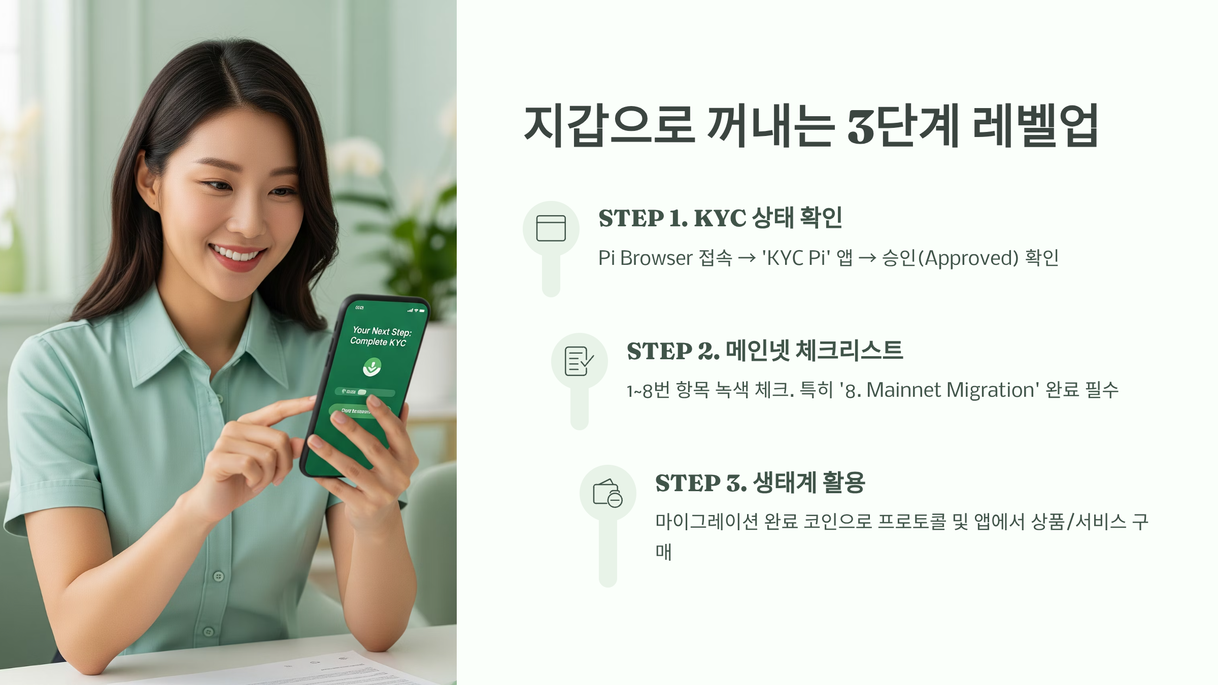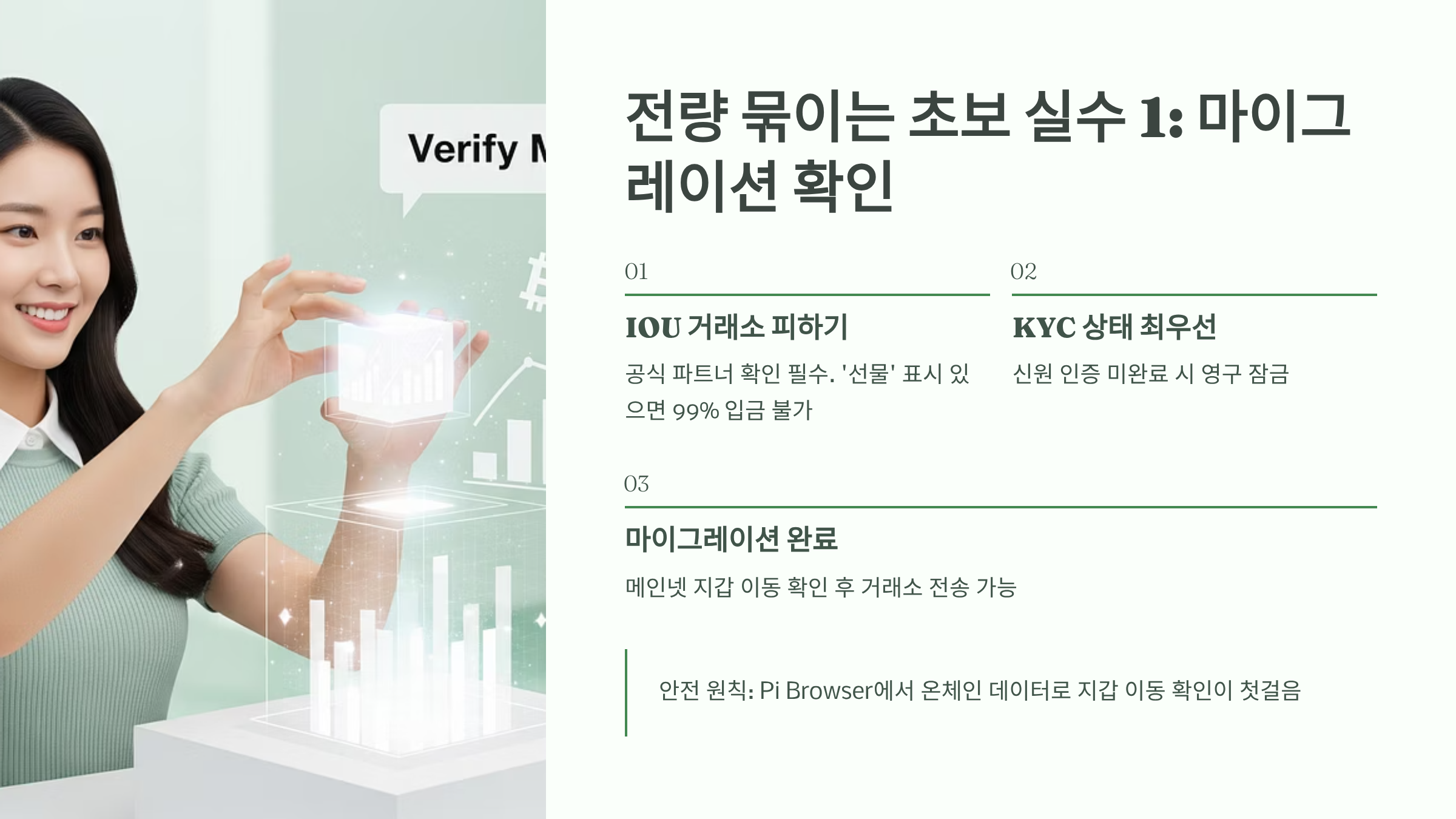 A: 코인이 묶이는 초보 실수를 막기 위해 가장 중요한 것은 두 가지입니다. 첫째, **KYC 인증** 절차를 완료해야 합니다. 둘째, **메인넷 체크리스트**의 '8. Mainnet Migration' 항목까지 완료하여 코인이 여러분의 지갑으로 **안전하게 이동**되었는지 **Pi Browser**를 통해 확인해야 합니다. **KYC 미완료 코인**은 활용할 수 없습니다.