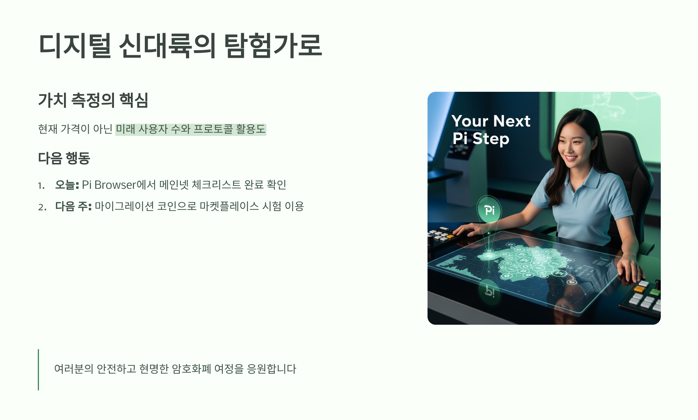 파이코인 생태계의 가치 측정은 '현재의 가격'이 아니라 '미래의 사용자 수와 프로토콜 활용도'라는 퍼즐 조각 맞추기에서 시작됩니다. 여러분이 이 글을 통해 얻은 지식은 단순한 정보가 아닌, 암호화폐라는 디지털 신대륙을 탐험할 수 있는 가장 강력한 무기입니다.