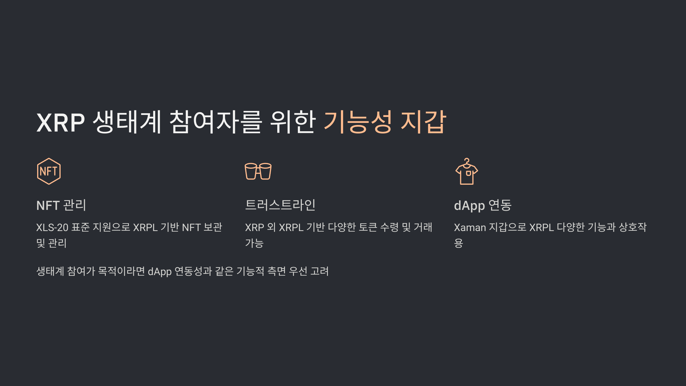 Xaman은 단순한 송금 기능을 넘어 XRPL의 다양한 기능과 상호작용할 수 있는 관문 역할을 합니다. 트러스트라인(Trustline) 설정을 통해 XRP 외에 XRPL 기반의 다양한 토큰을 수령하고 거래할 수 있으며, XLS-20 표준을 지원하여 XRPL 기반 NFT를 보관하고 관리할 수 있습니다. 향후 XRPL에 스마트 컨트랙트 기능인 'Hooks'가 도입되면 Xaman과 같은 기능성 지갑의 중요성은 더욱 커질 전망입니다. 따라서 생태계 참여가 목적이라면 보안도 중요하지만, dApp과의 연동성과 같은 기능적 측면을 우선적으로 고려해야 합니다.