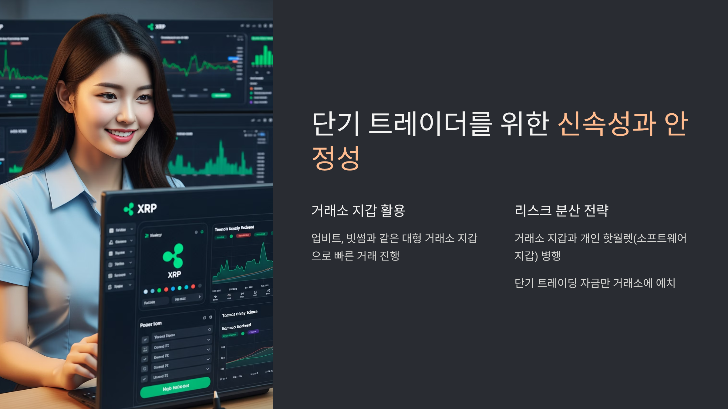 | 적극적 트레이더 | 신속한 거래, 리스크 관리 | 국내 대형 거래소 지갑 | 소프트웨어 지갑 (Xaman) | 거래 자금 외 즉시 개인 지갑 이동 |